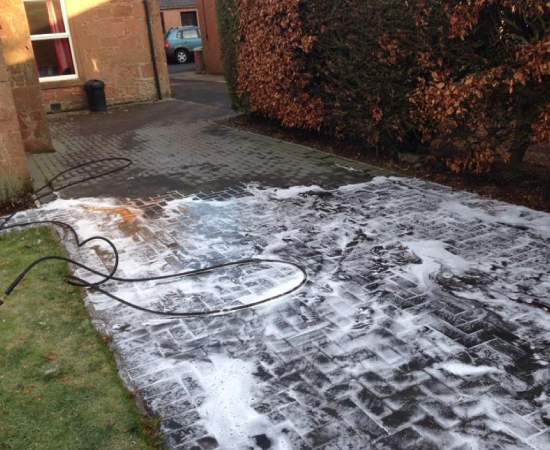 softwashing uses lower water pressure along with a down stream injection of solutions.